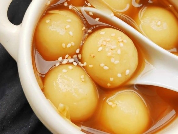 Chè trôi nước (hay còn gọi là chè Đoàn Viên) ko thể thiếu trong mâm cúng rằm tháng giêng không chỉ thể hiện cho sự gắn kết, đoàn tụ của gia đình mà còn mang hàm ý cầu mong một năm trôi chảy, suôn sẻ. Bột nếp được thành những viên tròn nhỏ nấu cùng nước đường và gừng.