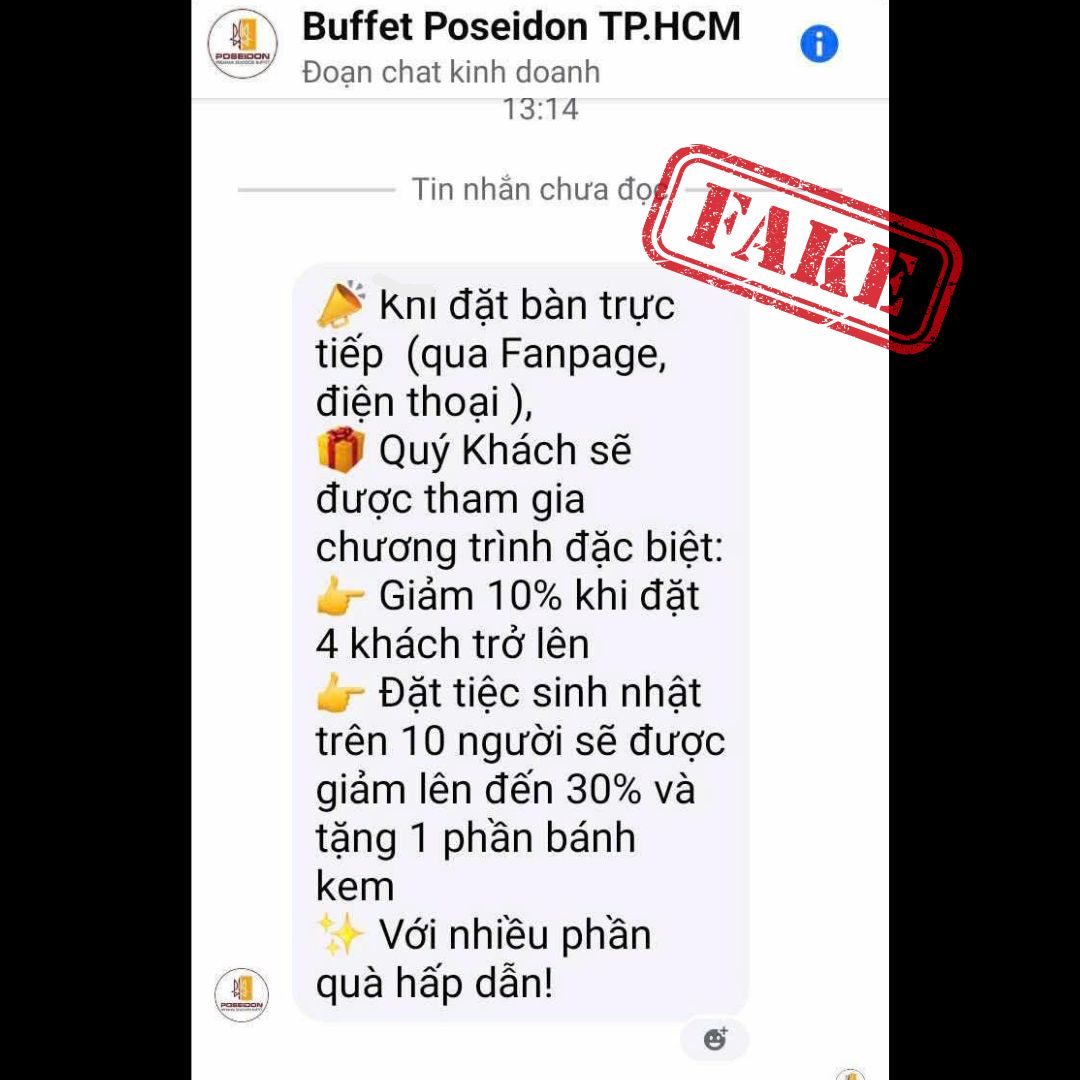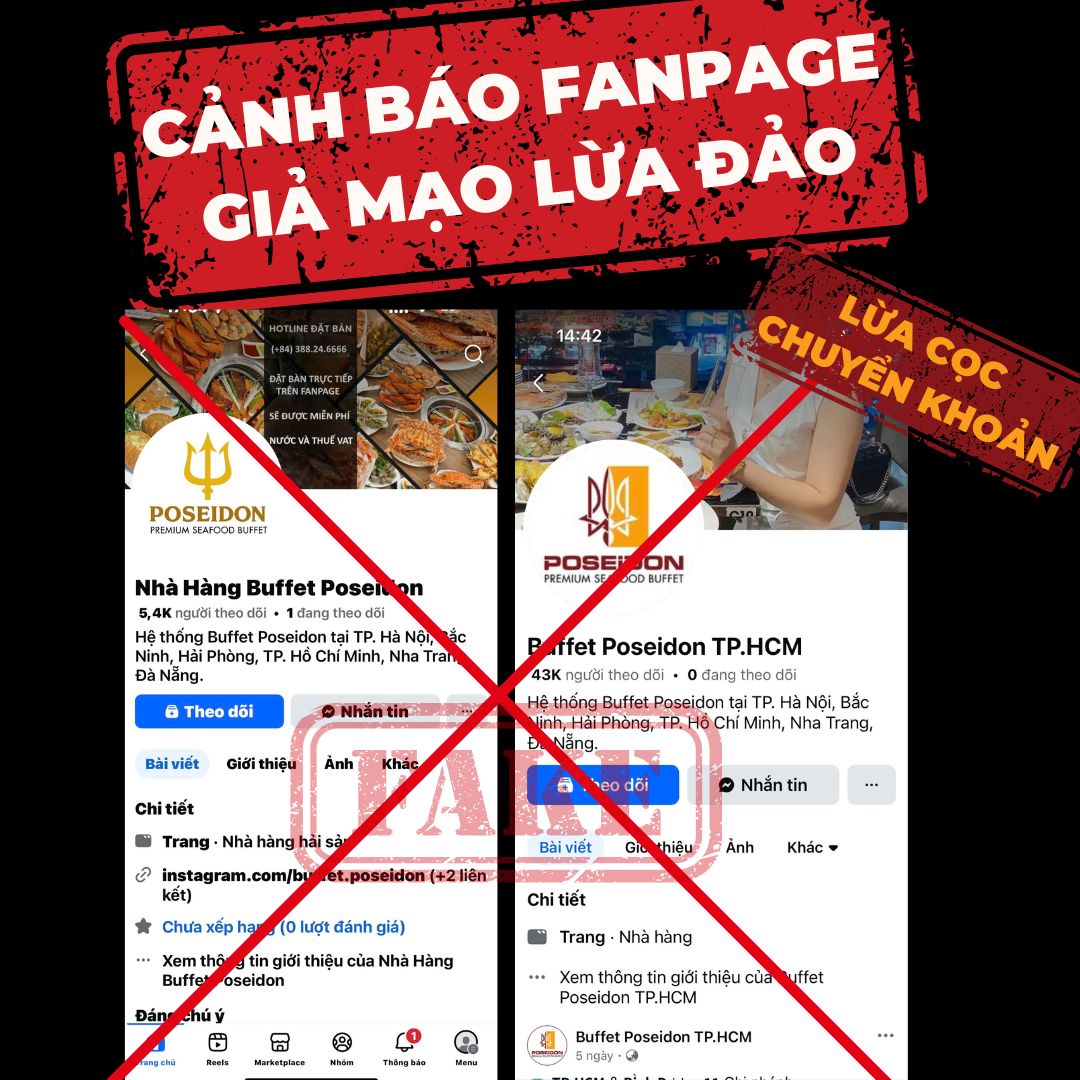 Hiện nay, một số fanpage giả mạo thương hiệu “Buffet Poseidon TP.HCM” đang sử dụng hình ảnh, logo và nội dung tương tự fanpage thật của hệ thống Poseidon, chúng đăng tải các nội dung khuyến mãi, giảm giá, đăng lại video livetreams cũ nhằm lừa khách hàng đặt bàn, sau đó chuyển khoản cọc giữ bàn và chiếm đoạt.