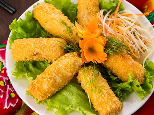 Nem hải sản được chiên vàng óng, giòn rụm, nhân tôm ngọt mềm, mực sần sật, sốt béo ngậy.