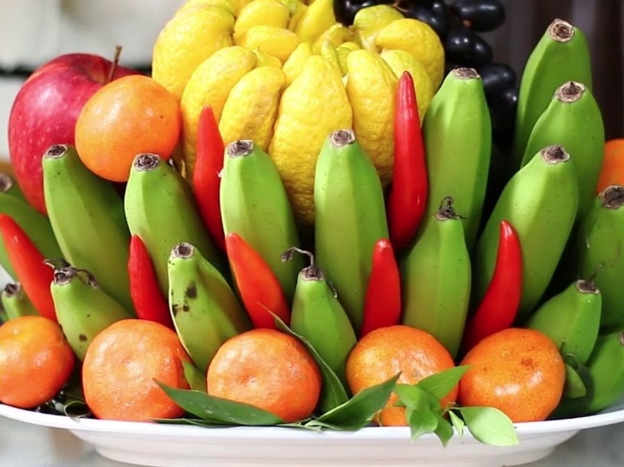 Mâm ngũ quả thường được bày biện trên bàn thờ gia tiên với các loại quả có màu sắc sặc sỡ, tượng trưng cho ngũ hành.