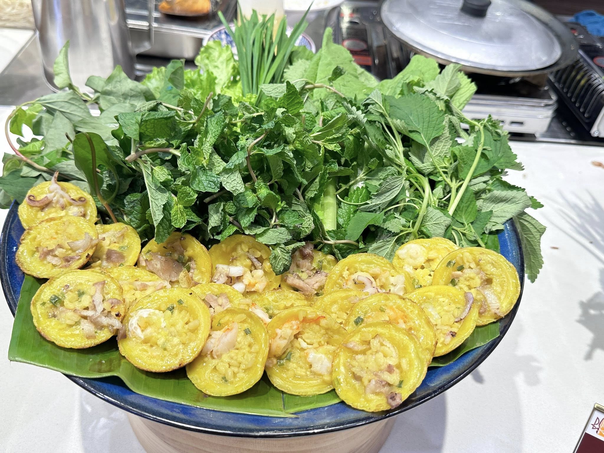 Xuôi tiếp về phương Nam, quầy chợ quê trở nên rộn ràng hơn với những món ăn mang tinh thần phóng khoáng của miền sông nước. Bánh xèo vàng ruộm, giòn từ mép bánh, nhân tôm thịt đầy đặn, cuốn với rau sống miệt vườn rồi chấm mắm chua ngọt, chỉ cần cắn một miếng là cảm giác như cả miền Tây ùa về trong vị giác. Bánh khọt nhỏ xinh, thơm mùi nước cốt dừa, mặt bánh giòn nhẹ, nhân tôm nóng hổi, ăn rất dễ ghiền. Xen kẽ đó là những món quen thuộc như thịt xiên nướng, nem chua rán, gỏi cuốn, các loại nộm rau – những món ăn tưởng chừng rất đời thường nhưng lại chính là sợi dây gắn kết ký ức của nhiều thế hệ.
