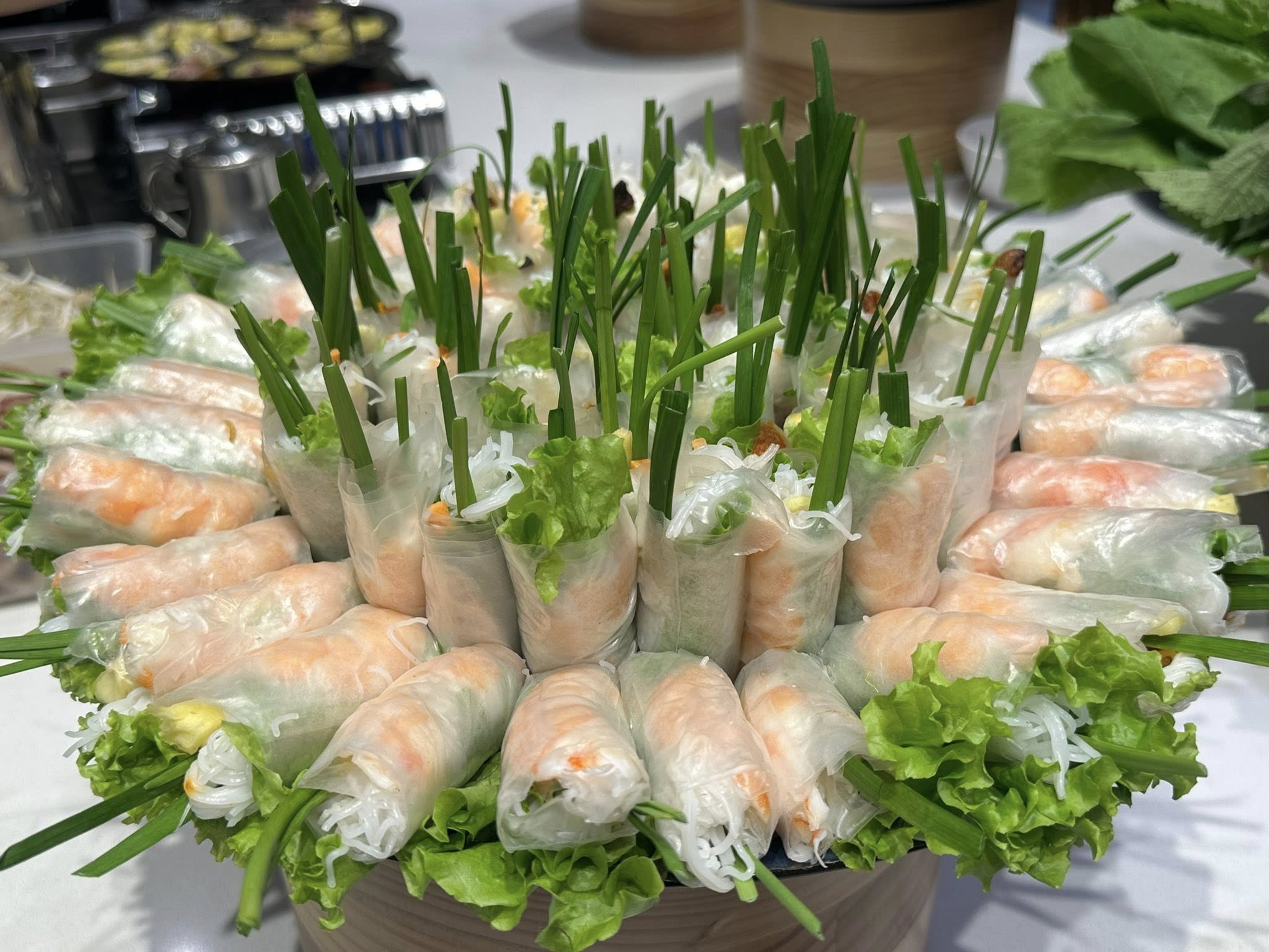 Từ Bắc vào Trung, không gian ẩm thực chuyển mình sang sắc thái mộc mạc, nắng gió nhưng đầy cuốn hút. Bánh tráng cuốn thịt heo từng là “đặc sản quốc dân” của Đà Nẵng nay được tái hiện trọn vẹn tại Poseidon. Thịt heo luộc mềm, bún trắng, rau sống đủ loại, cuốn cùng bánh tráng mỏng, chấm mắm nêm đậm đà, ăn một cuốn là thấy rõ cái hồn của miền Trung: giản dị nhưng rất khó quên.