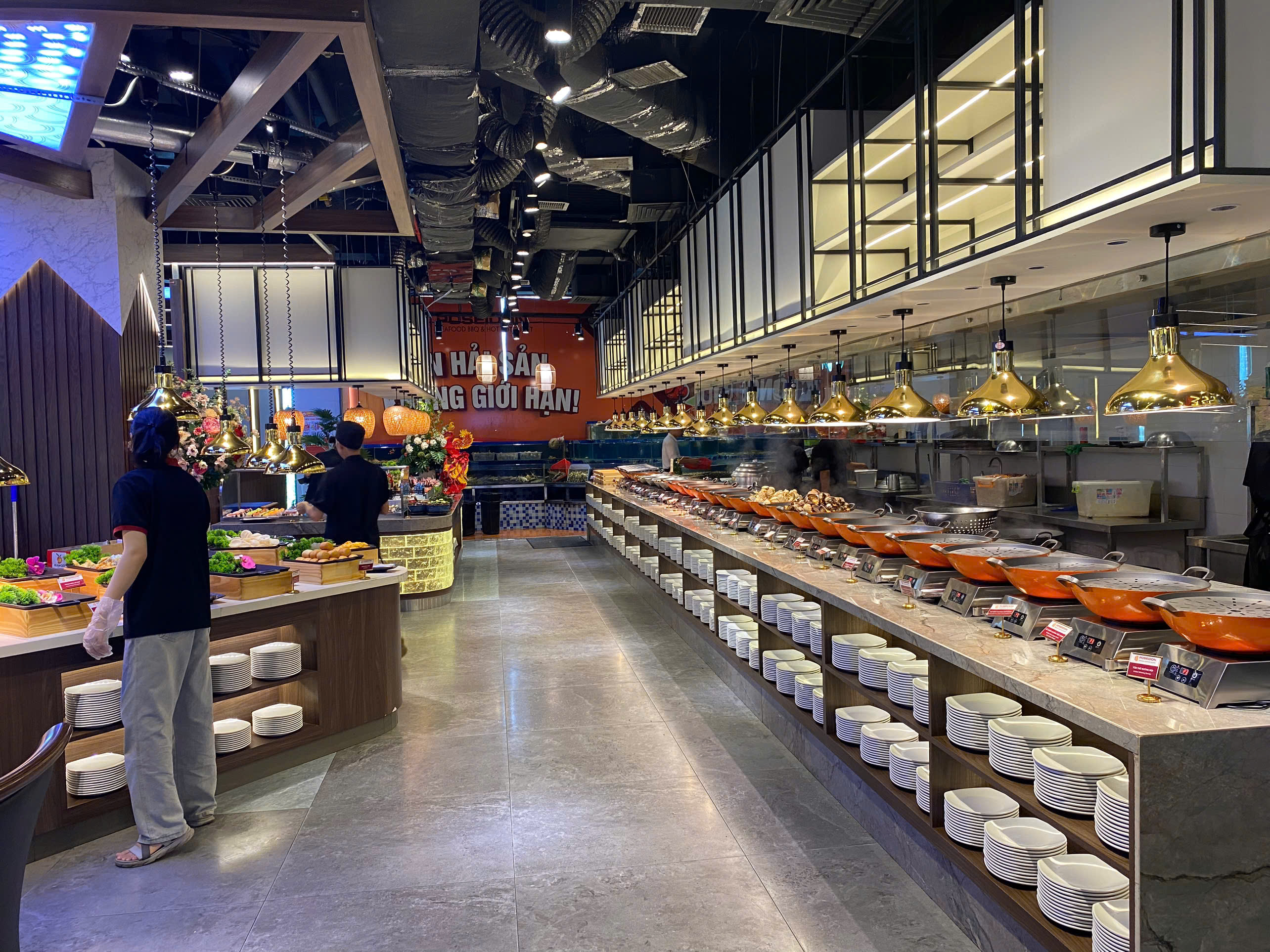 Quầy line cũng được sắp xếp rõ ràng, chia khu hợp lý để khách dễ chọn món. Từ hải sản đến món nóng, món Việt hay món quốc tế đều được trình bày chỉn chu, tạo cảm giác ngon miệng ngay từ ánh nhìn đầu tiên.