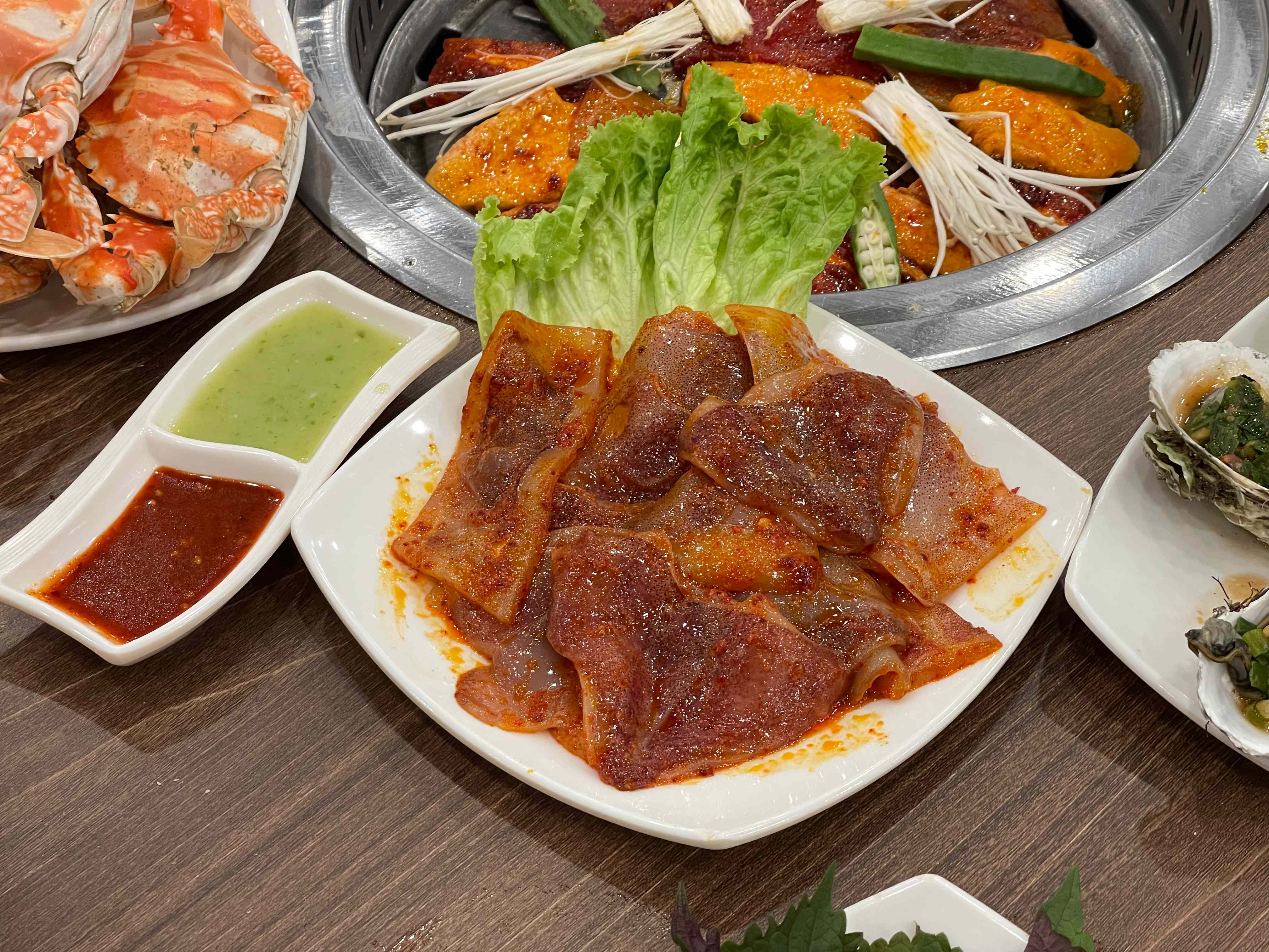 Hải sản đa dạng để nướng như mực ướp sate, bao tử cá ướp sốt cay, ướp tiêu đen, bạch tuộc ướp tiêu đen, tôm càng xanh bơi.