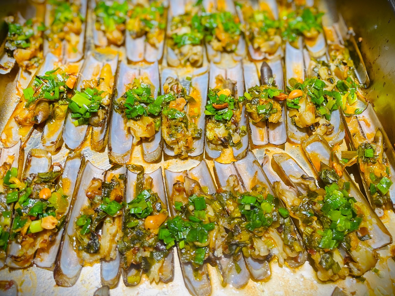 Ốc móng tay nướng mỡ hành trên quầy nướng Buffet Poseidon