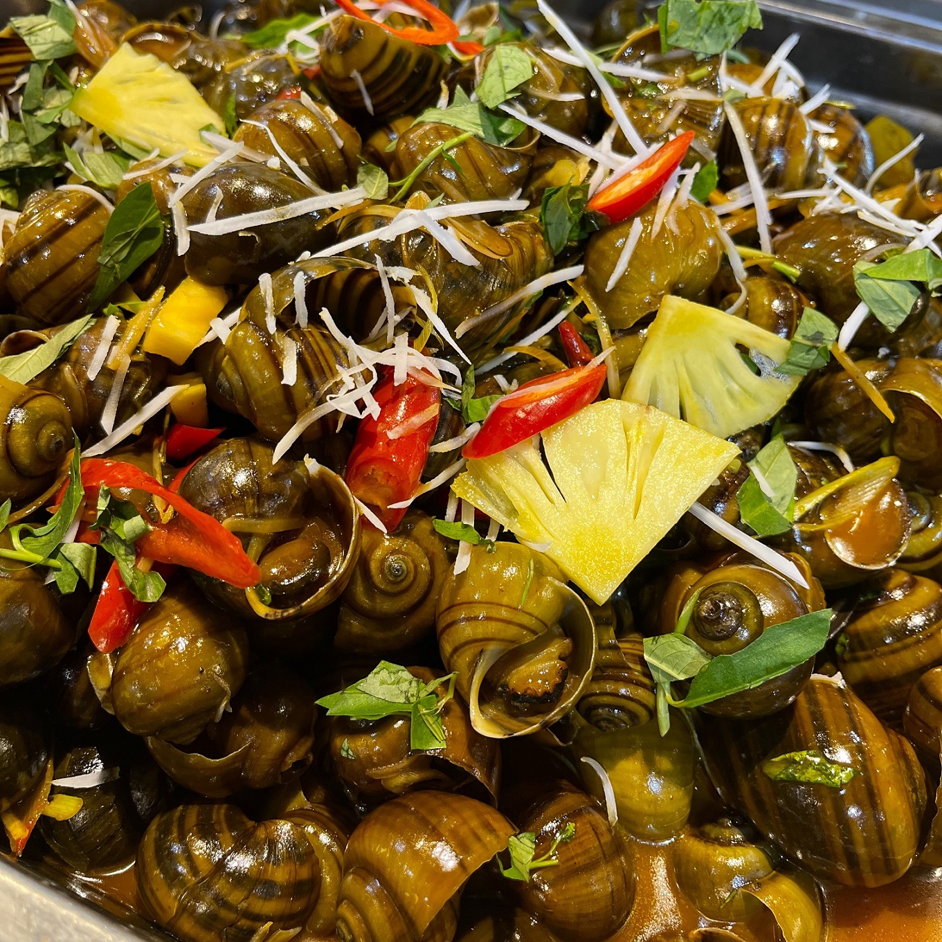 Món ốc mít xào me ở quầy nóng nhà Buffet Poseidon.