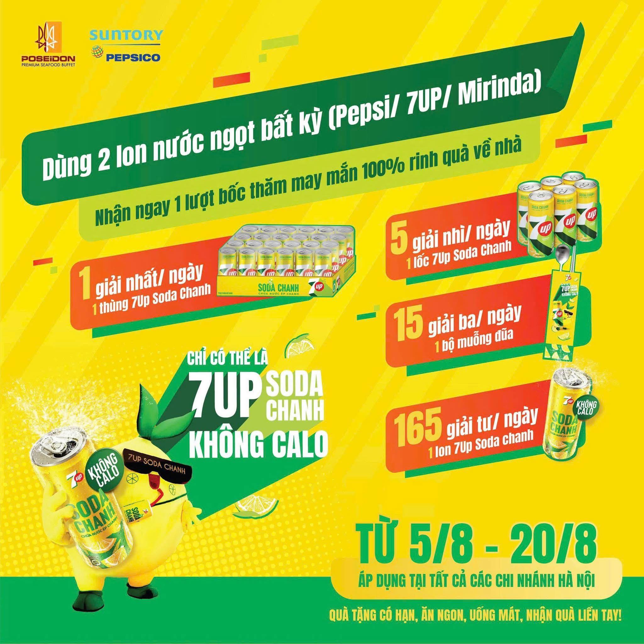 Từ ngày 5/8 đến hết ngày 20/8/2025, khách hàng khi dùng 02 lon nước ngọt bất kỳ (Pepsi, 7UP hoặc Mirinda) tại các chi nhánh Poseidon khu vực Hà Nội sẽ nhận ngay 01 lượt bốc thăm trúng thưởng với tỉ lệ trúng 100%.