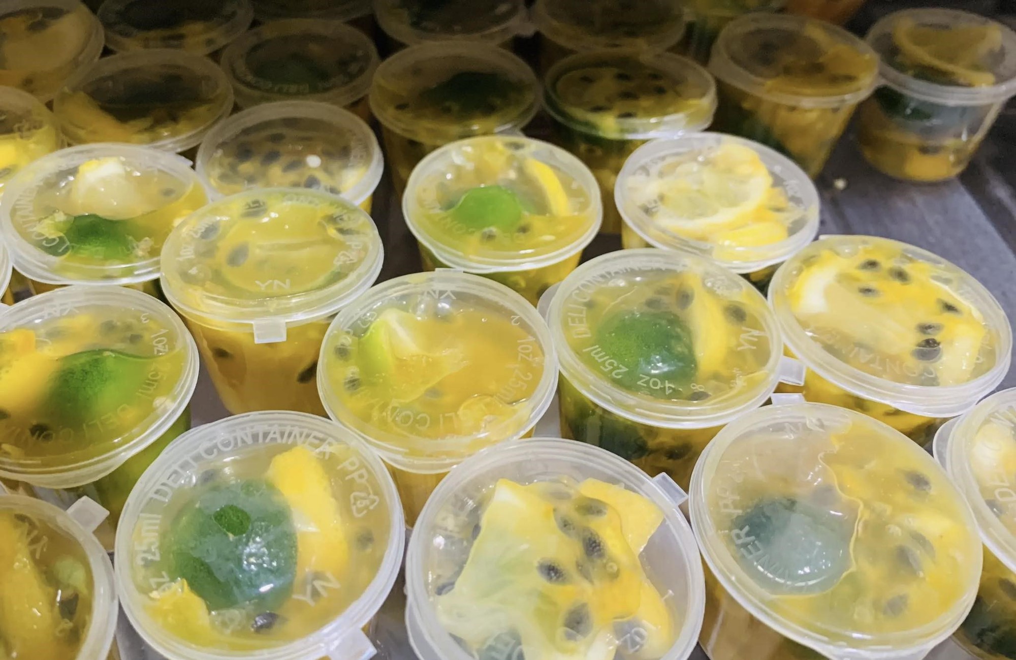 Bước 4: Rửa sạch, úp khô các lọ thủy tinh hoặc hộp nhựa 50ml - 100ml. Cho quất, các lát chanh vàng và nước cốt chanh leo mật ong vào rồi đậy nắp lại.