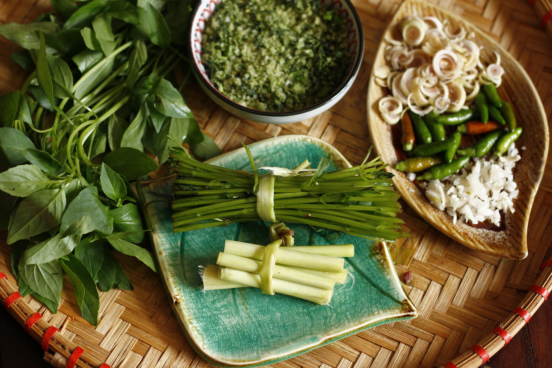 Gia vị chính cho món Gà lá é chính là lá é, sả, ớt, tỏi, hành củ và gừng