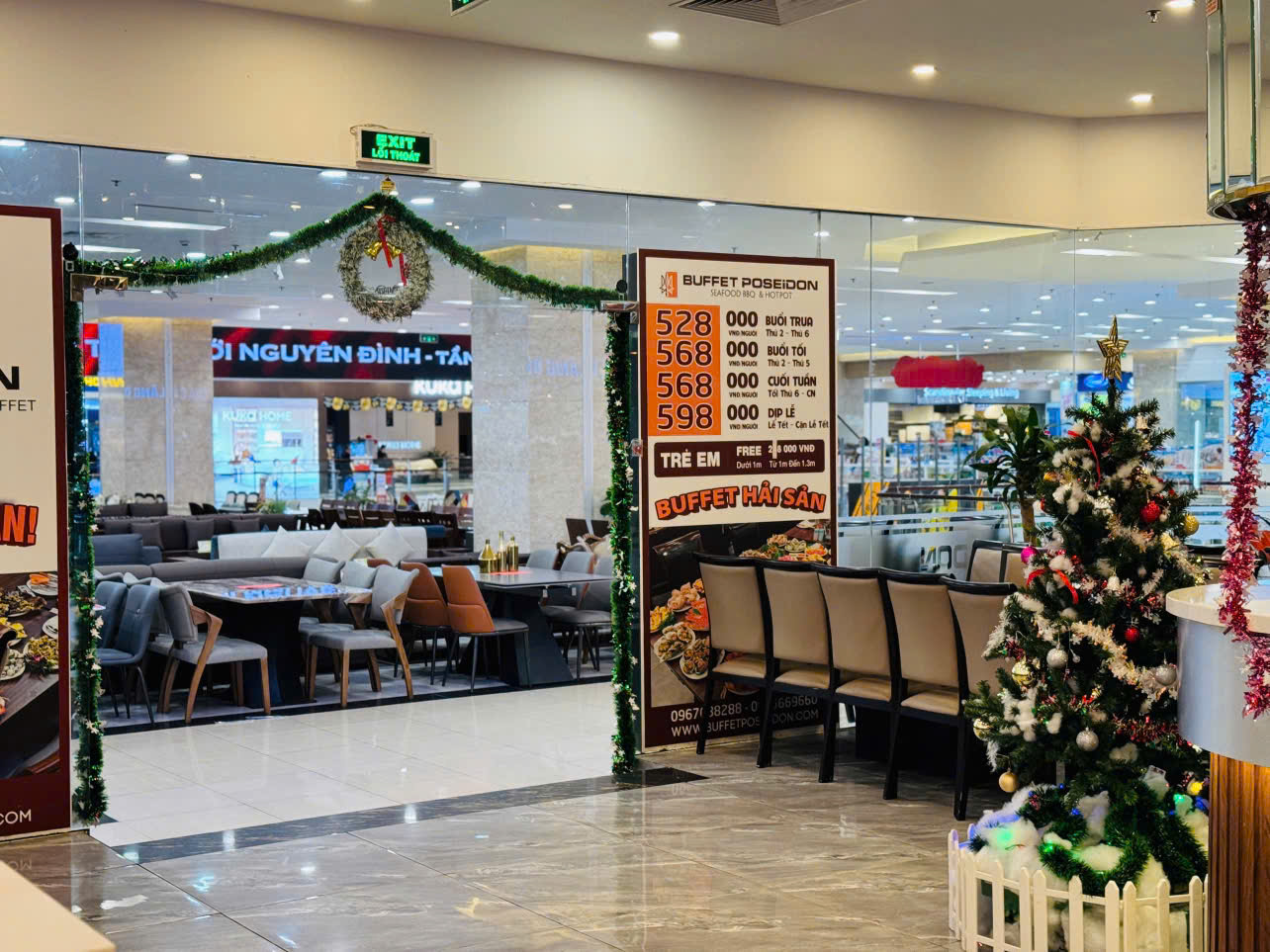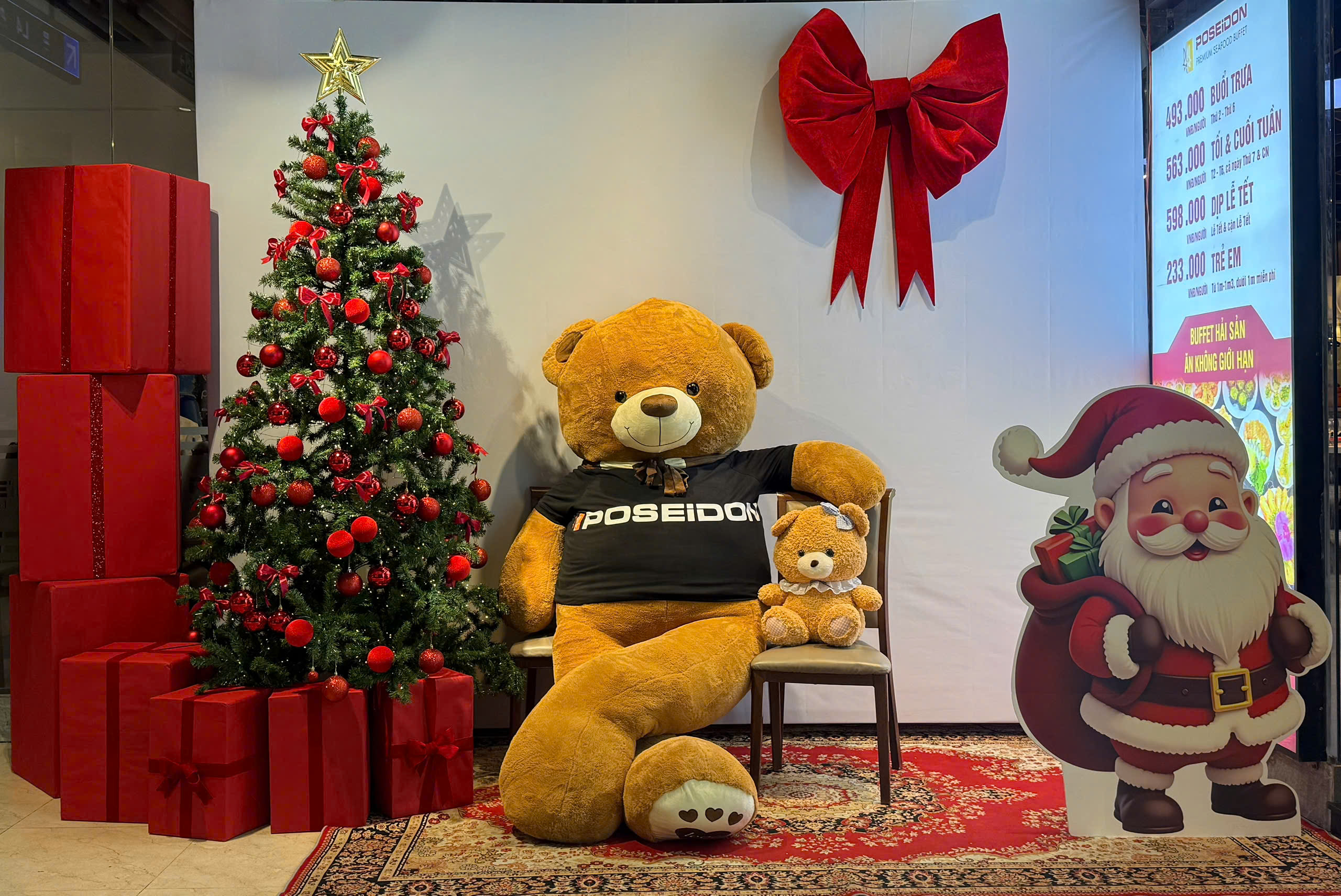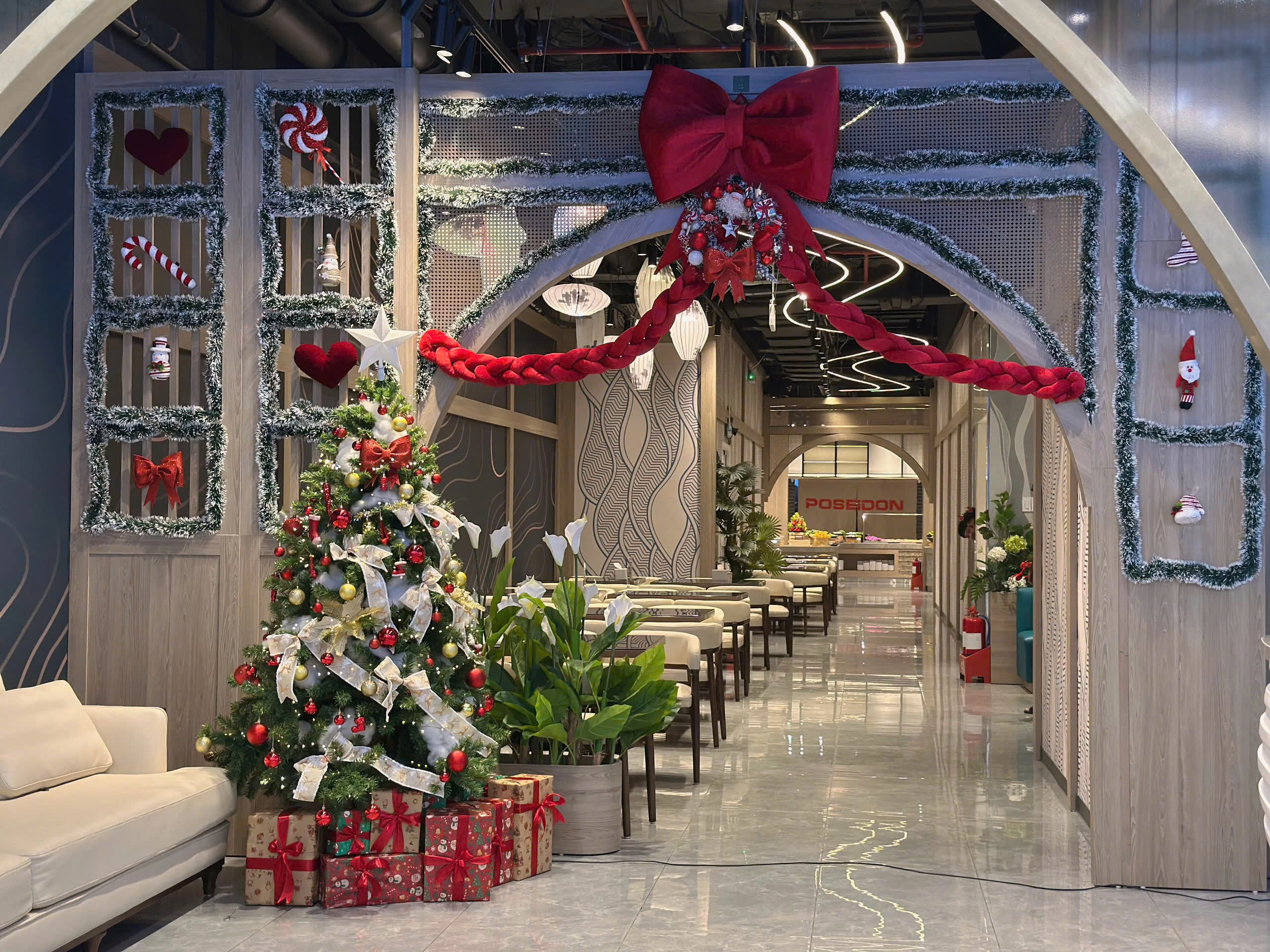 Từ Hà Nội, Bắc Ninh, Hải Phòng, Đà Nẵng, Nha Trang cho đến TP.HCM, mỗi chi nhánh Poseidon đều được trang hoàng tỉ mỉ với cây thông lớn, dây đèn vàng ấm, những tiểu cảnh Giáng sinh và góc check-in được đầu tư chỉn chu để mang đến cho khách hàng cảm giác như bước vào một thế giới mùa đông thu nhỏ, ngay giữa không gian buffet hải sản đặc trưng.