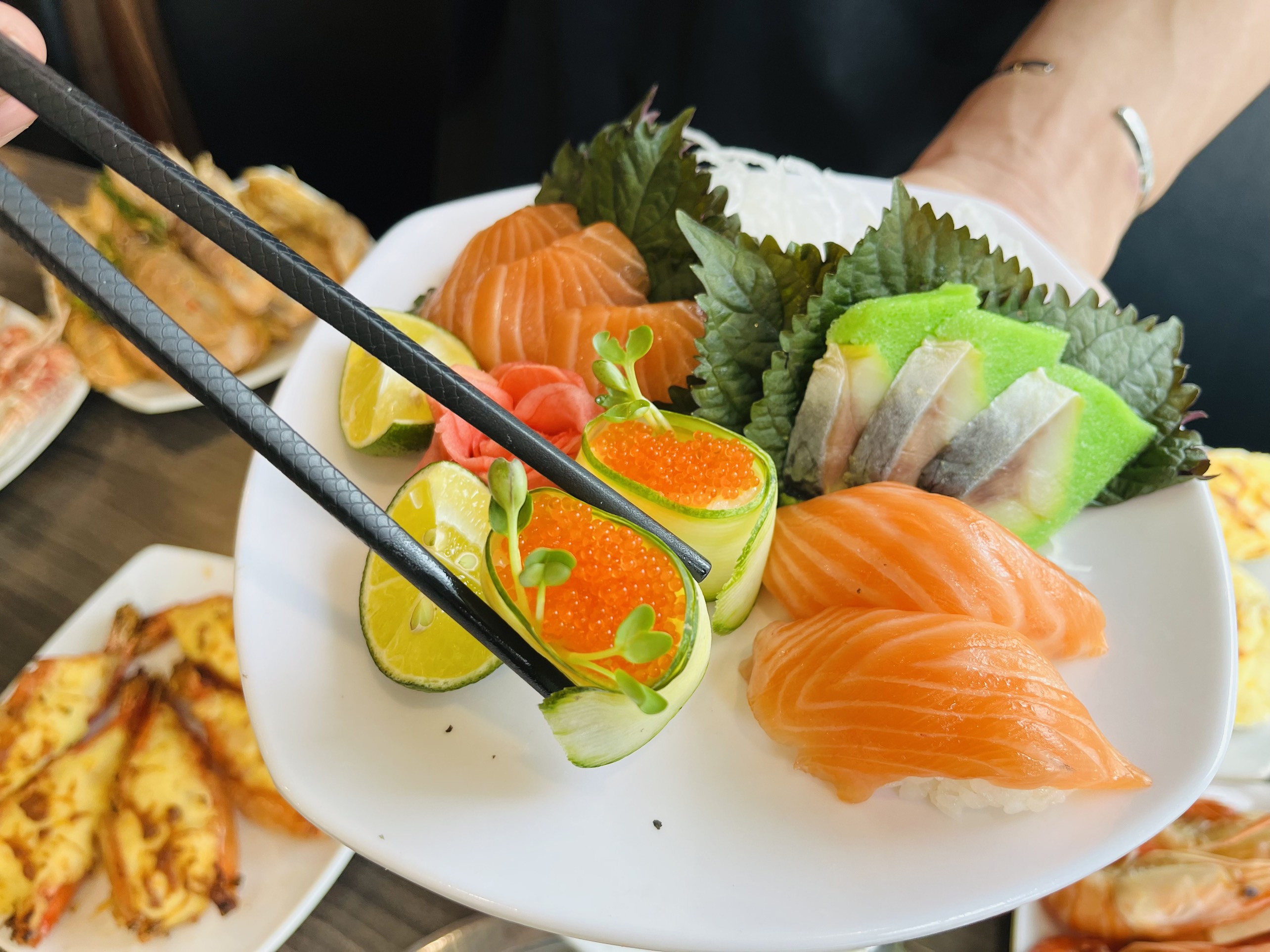 Poseidon đa dạng các loại hải sản, một trong số đó có sashimi cá hồi, cá trích, hàu, v.v...